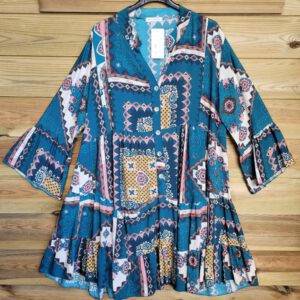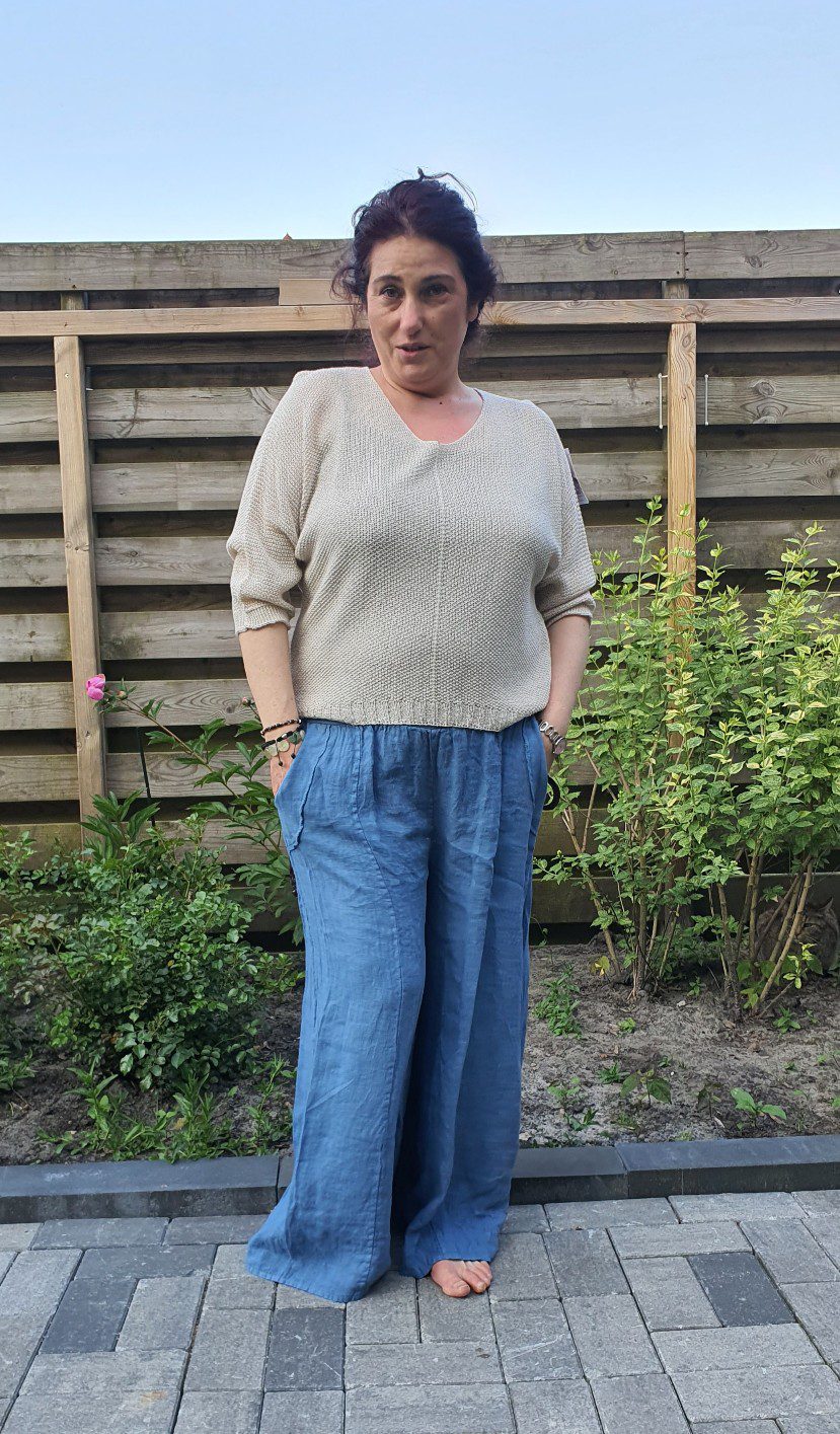 Boho Linnen broek met brede pijpen – steek zakken met een knop – zijzakken – kleur HEMELS BLAUW- maat 42