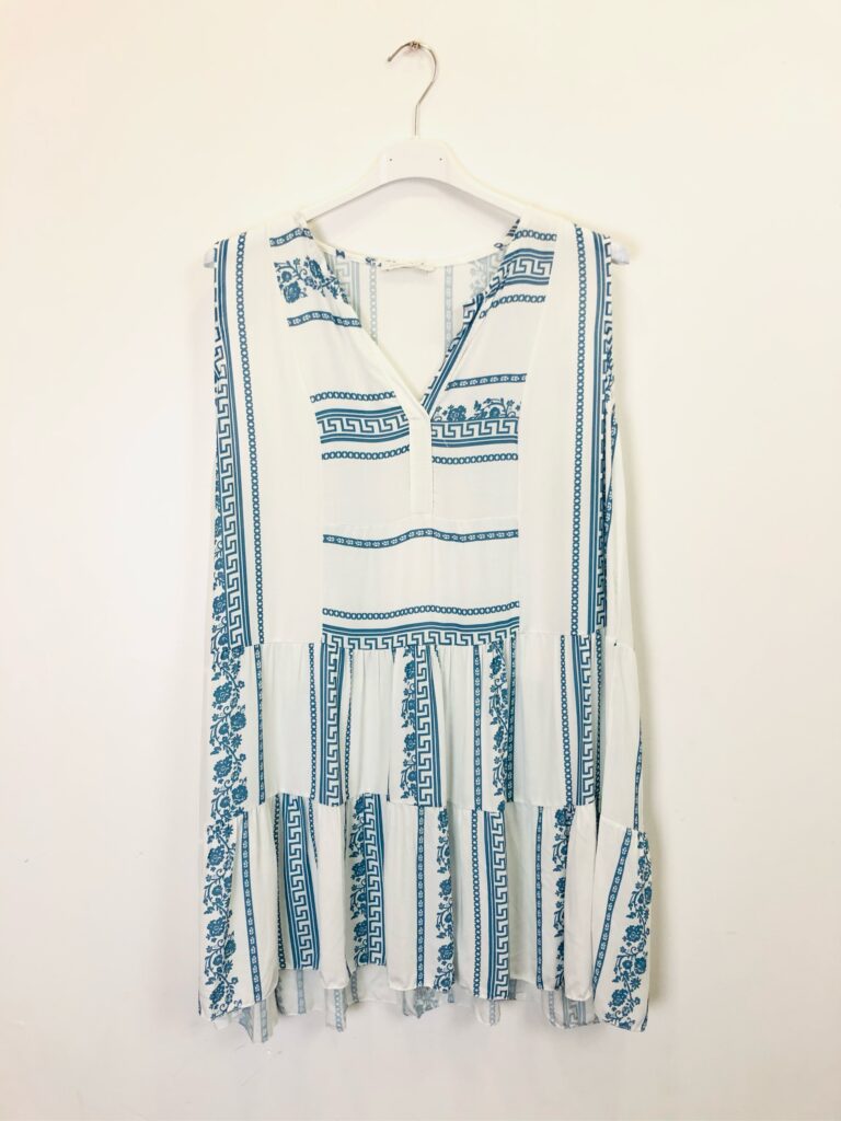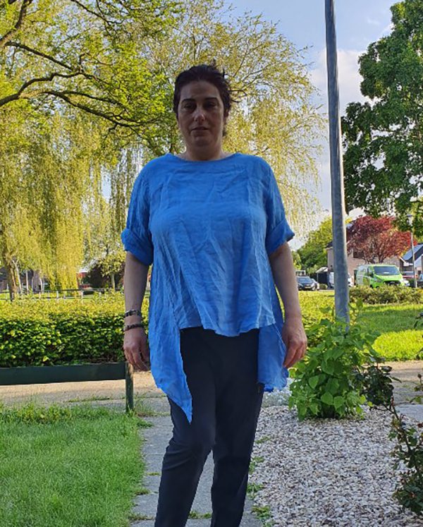 Mooi linnen top in BLAUW kleur met korte mouwen, asymmetrisch ronde hals maat 42