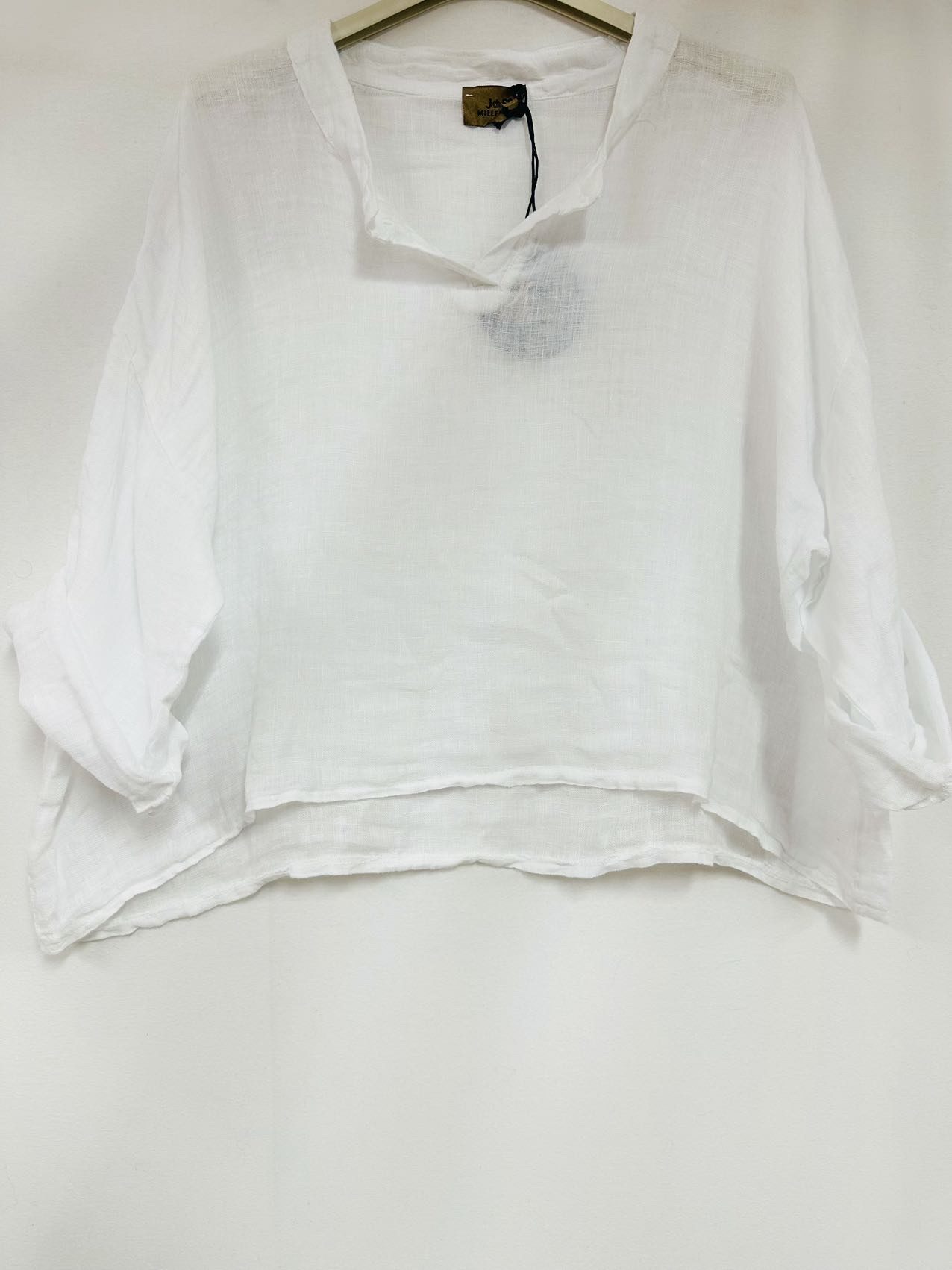 Mooi linnen korte – cropped top – v-hals hals – kraagje – raglan mouwen kleur WIT – one size