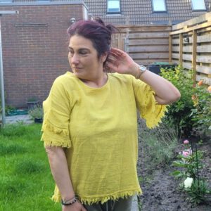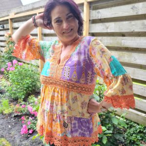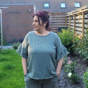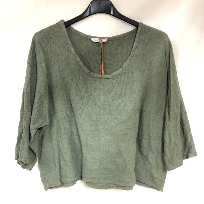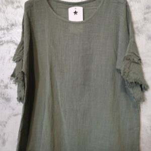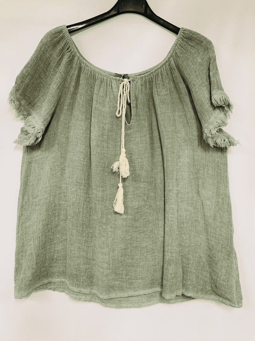 Boho top van linnen met raglan mouwen – ronde hals met strikje – loze zomer top – kleur MILITAIR GROEN – maat 40/42