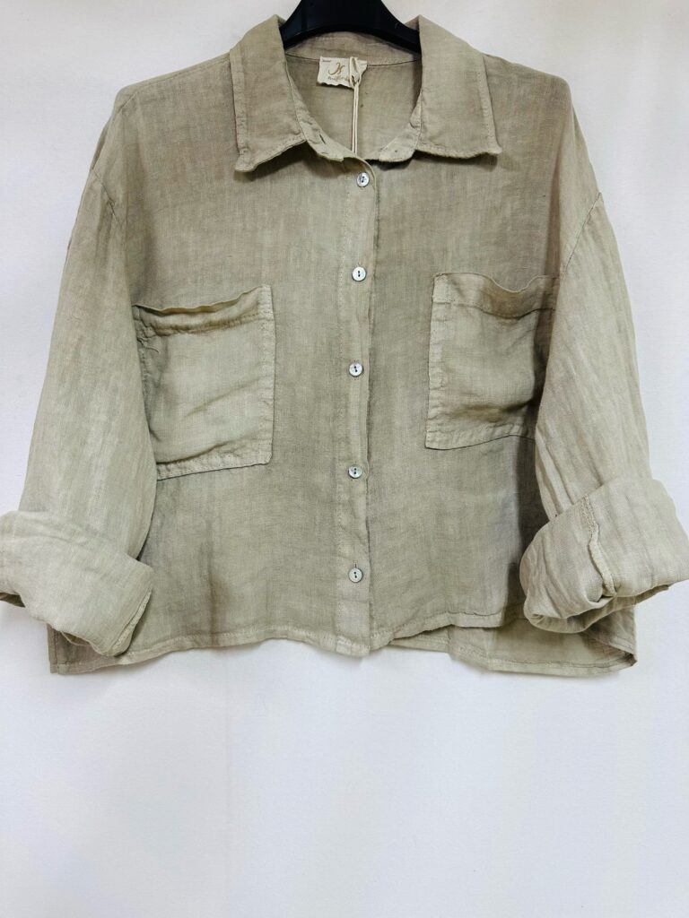 Luchtige linnen korte – crop top – ronde hals – raglan mouwen kleur KHAKI GROEN– one size