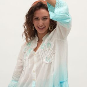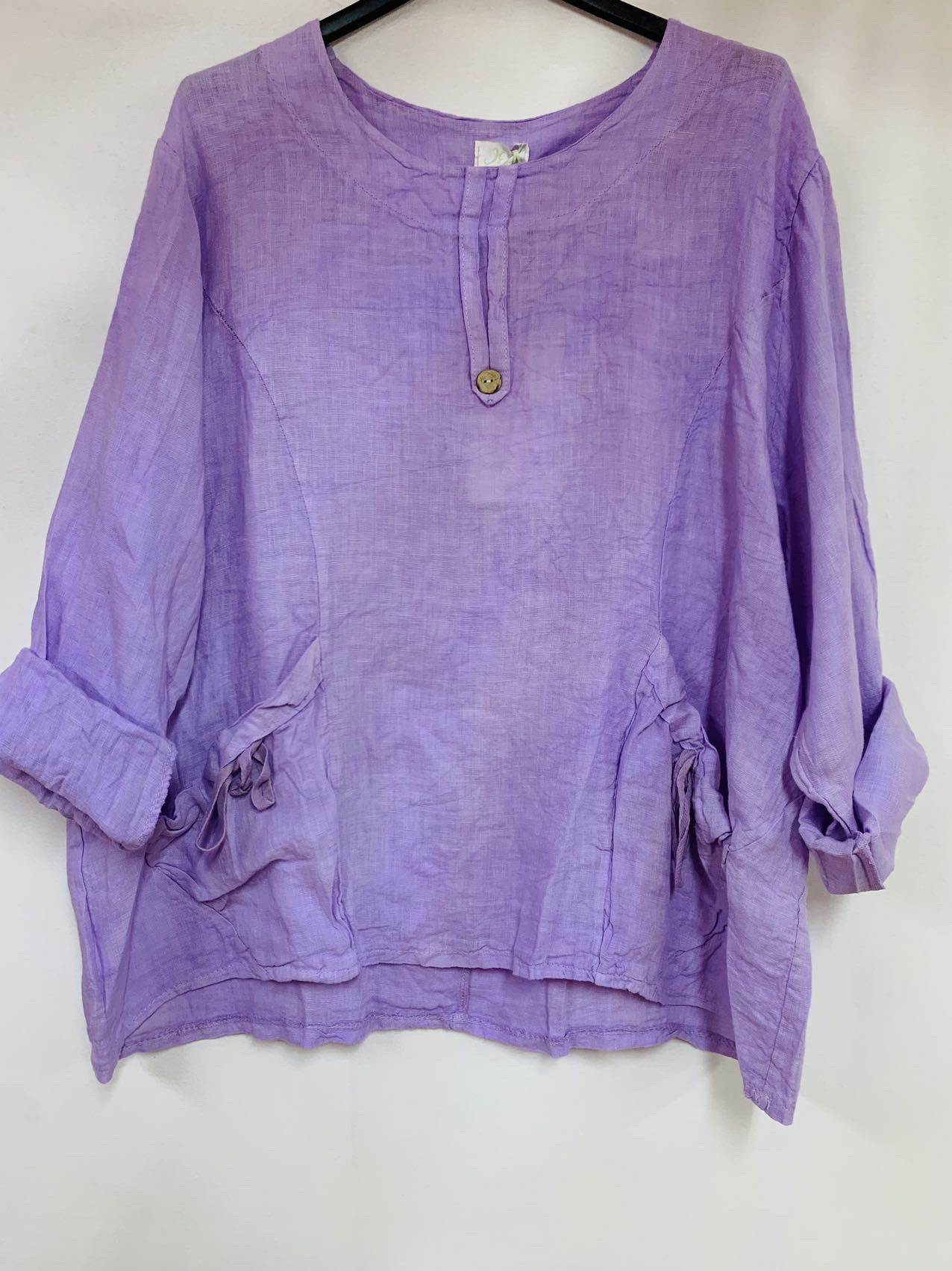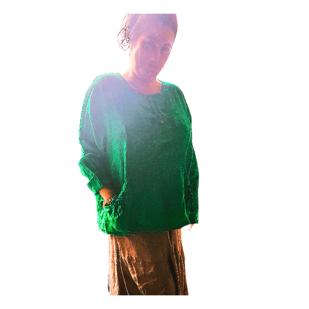 Linnen top met ronde hals – lange mouwen – voor zakken – kleur GRASS GROEN – Maat 44/46