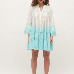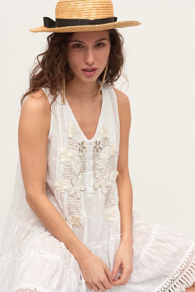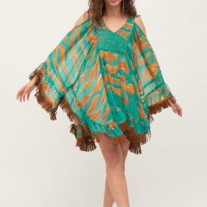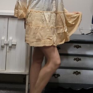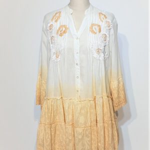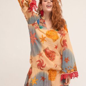 Linnen top met lange volant met verstelbare mouwen LICHT BRUIN, maat 42/44