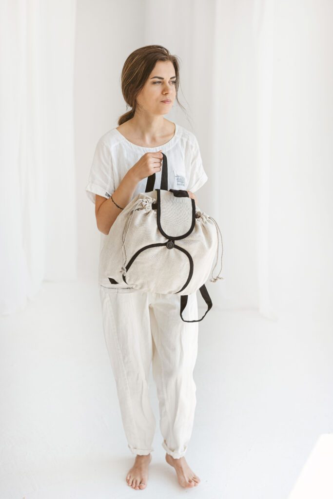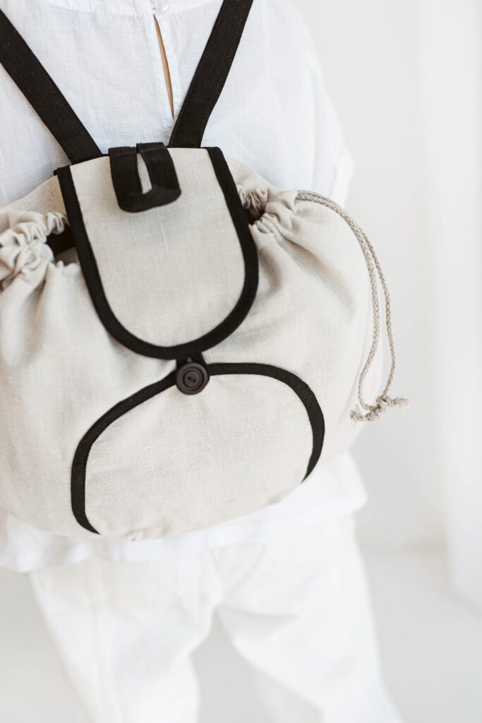 Aanbieding! Handgemaakte linnen rugzak in beige met zwarte lijnen – handige rugtas -aantrek koord