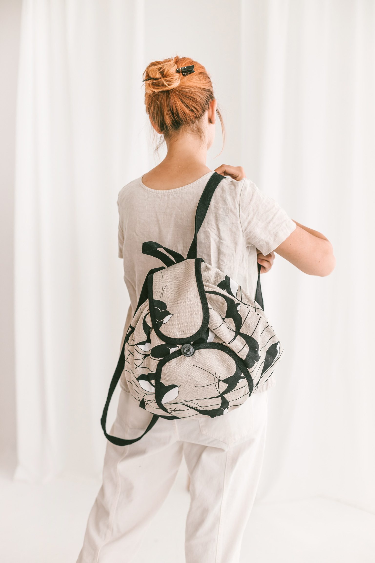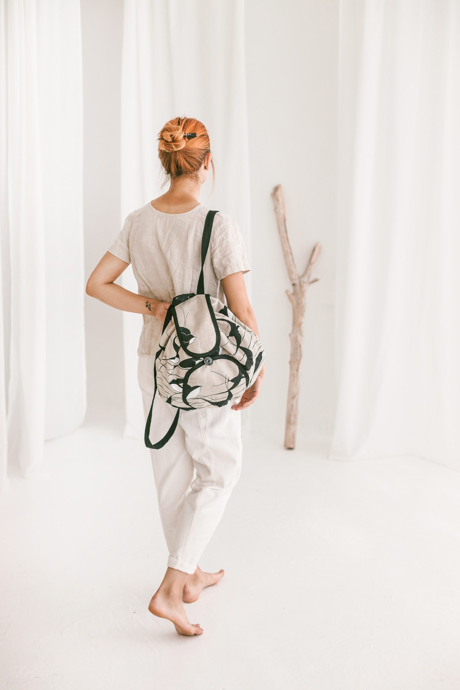 Aanbieding! Handgemaakte linnen rugzak in beige en zwarte tinten met vogels – handige rugtas -aantrek koord