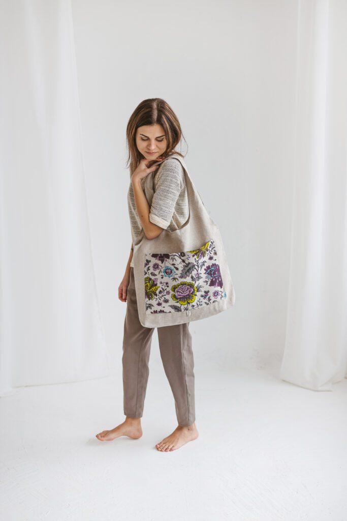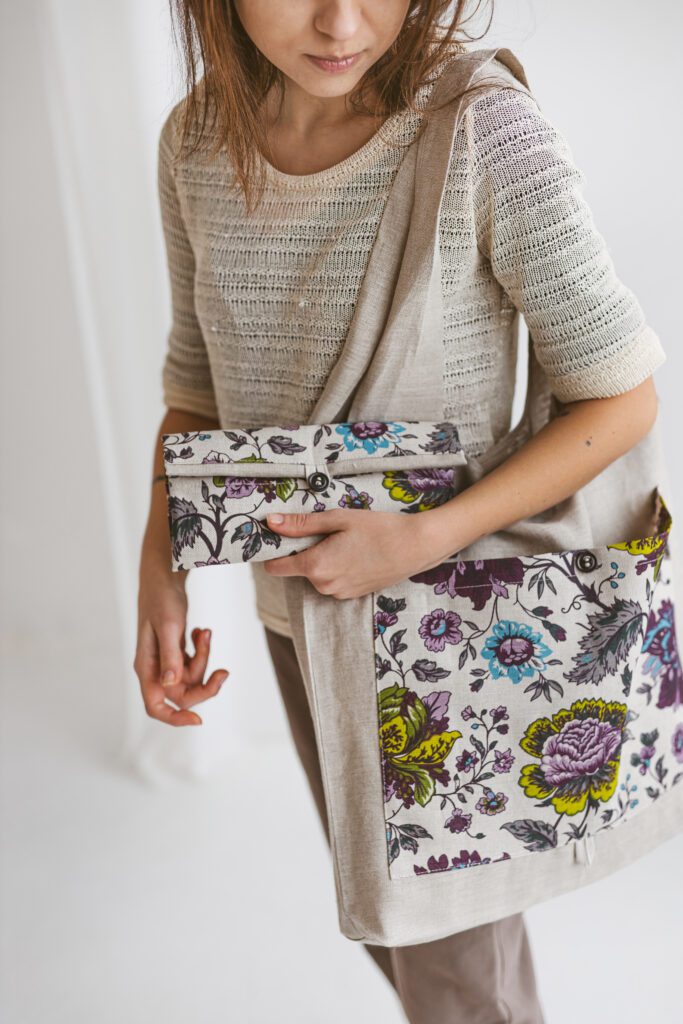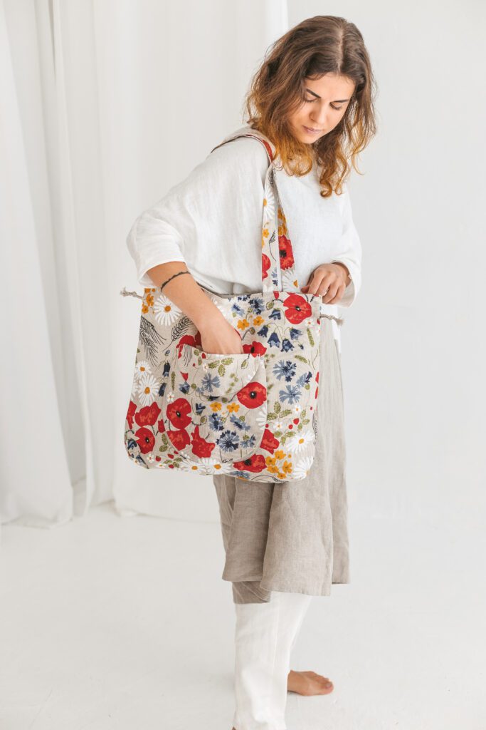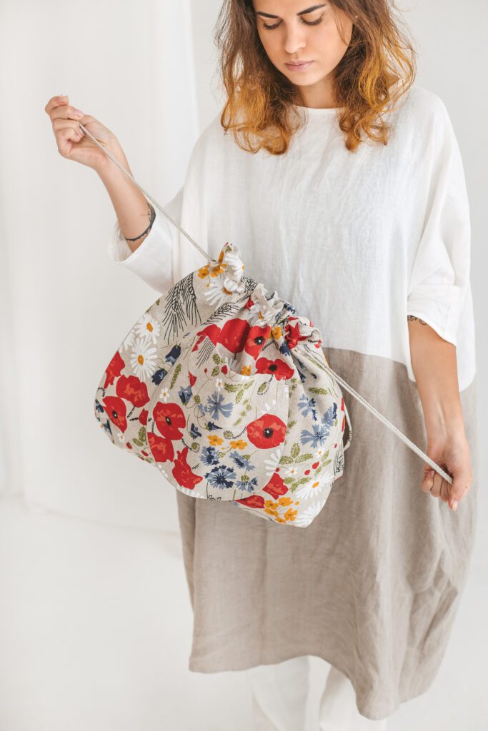 Aanbieding! Handgemaakte Linnen emmertas met wilde bloemen – aantrekkoord – voor zak – schouderband