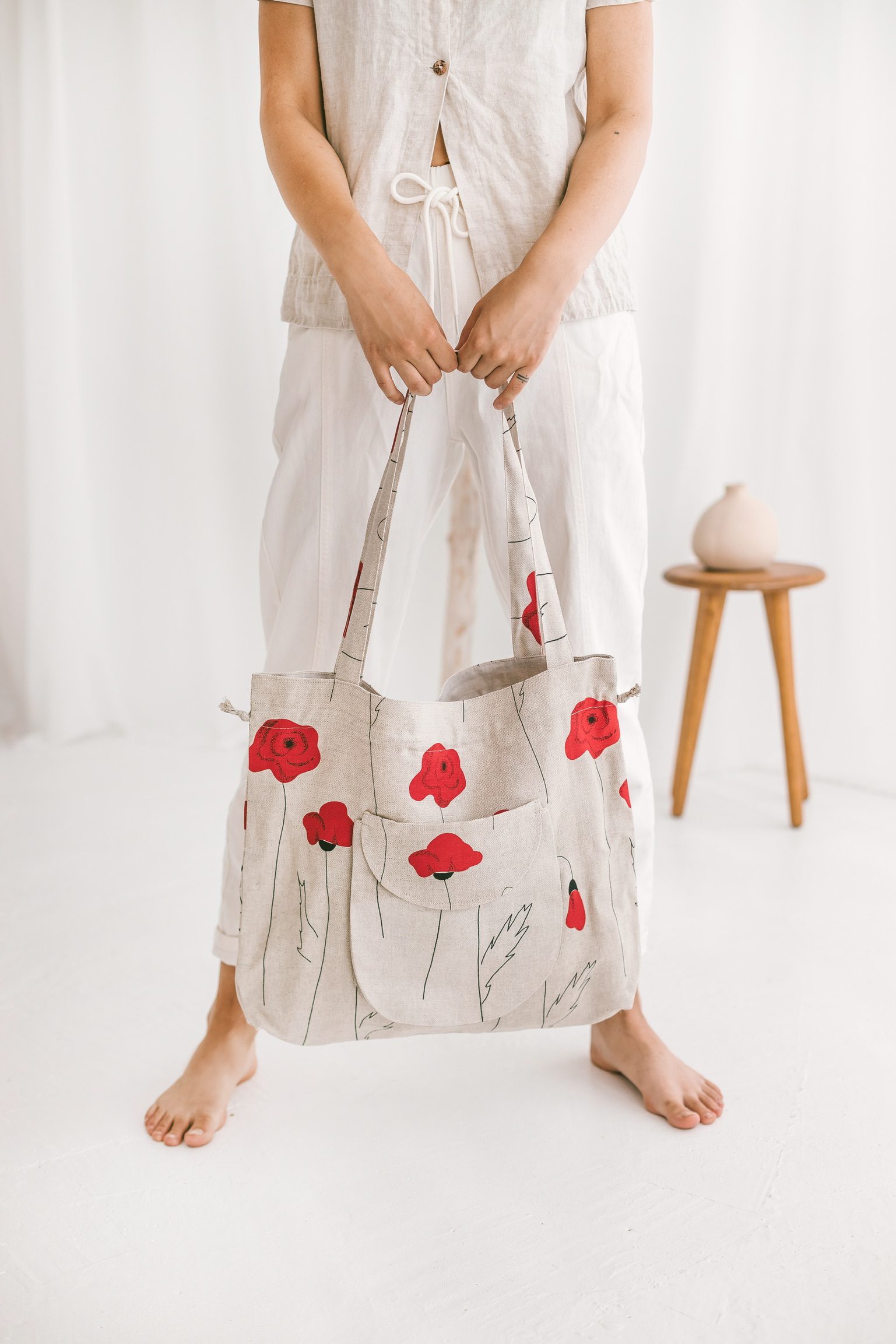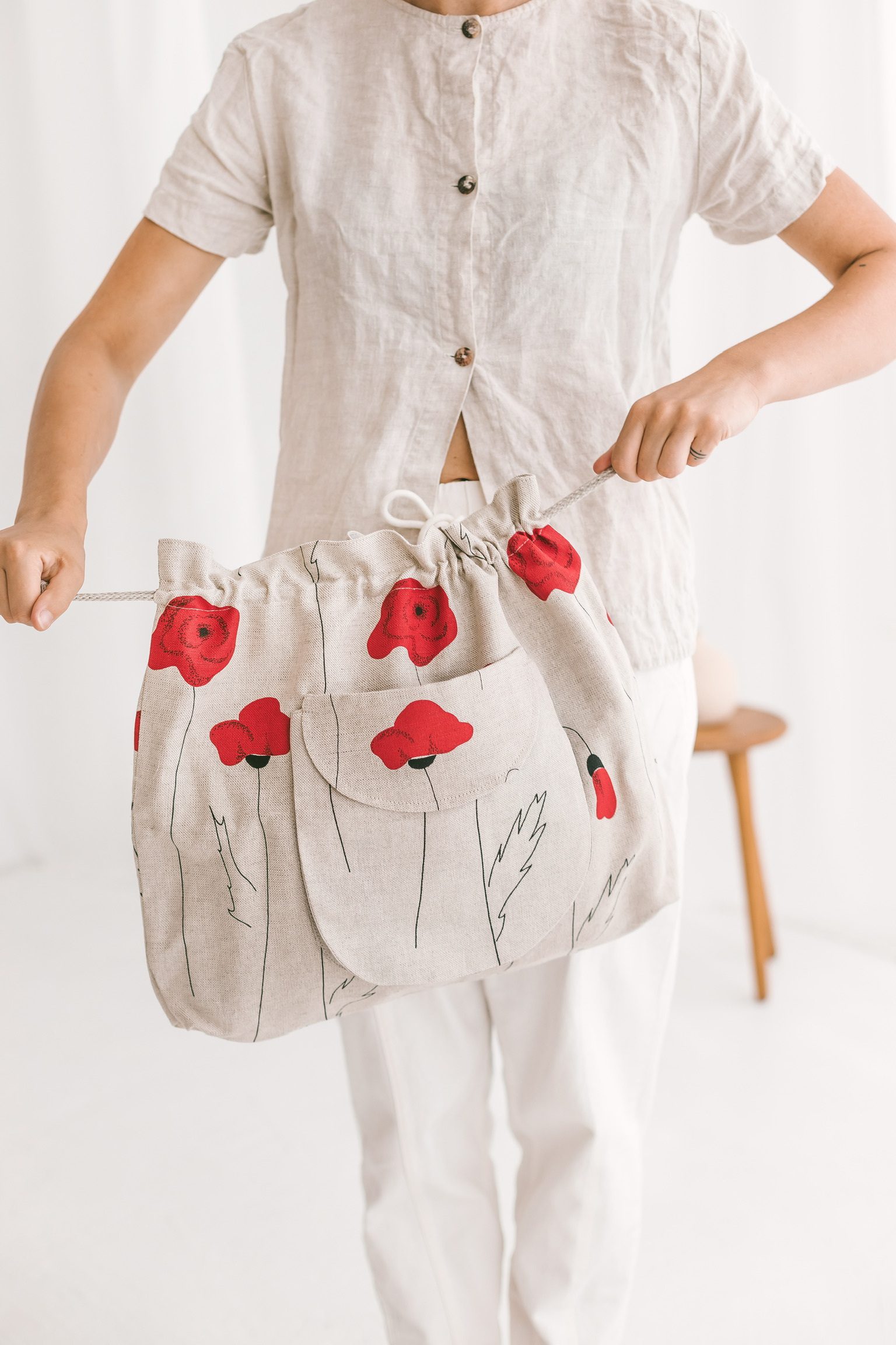 Aanbieding! Handgemaakte Linnen emmertas met rode klaprozen – aantrekkoord – voor zak – schouderband