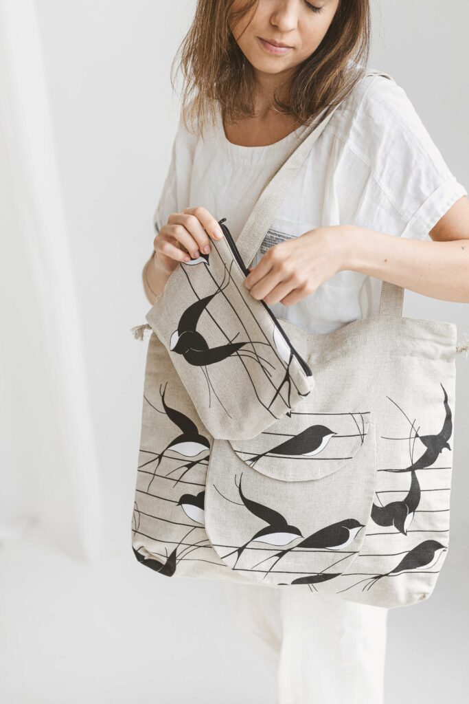 Aanbieding! Handgemaakte Linnen emmertas met vogels – aantrekkoord – voor zak – schouderband