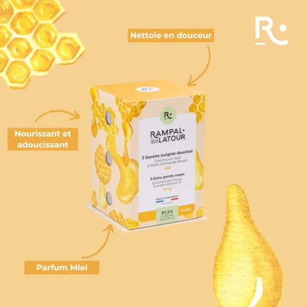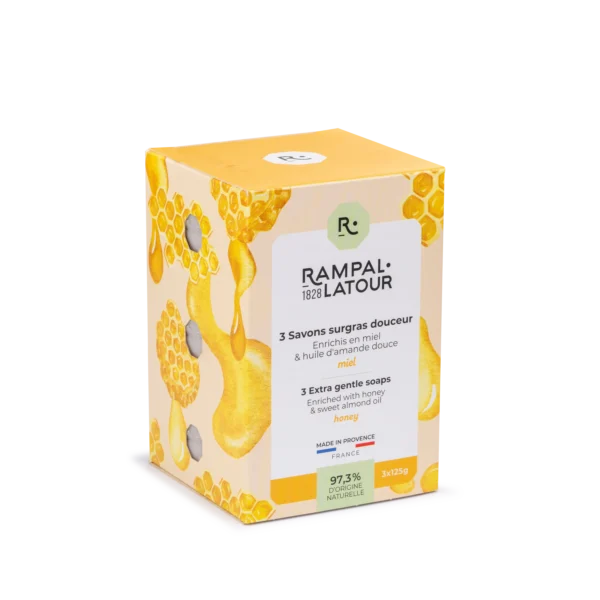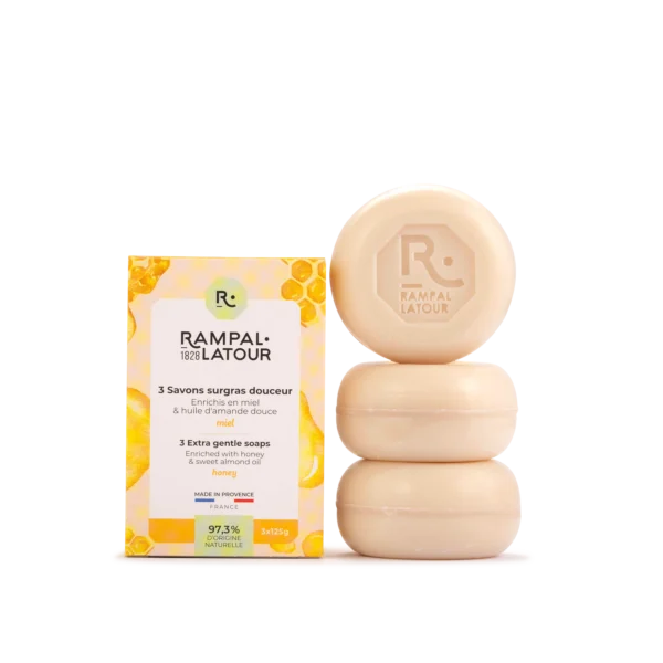 Ontdek de ronde zeepblokken met honinggeur: zeep met biologische olijfolie en zoete amandelolie. Vanwege de extra nettokosten worden er enkele items in de doos vermeld.