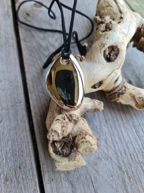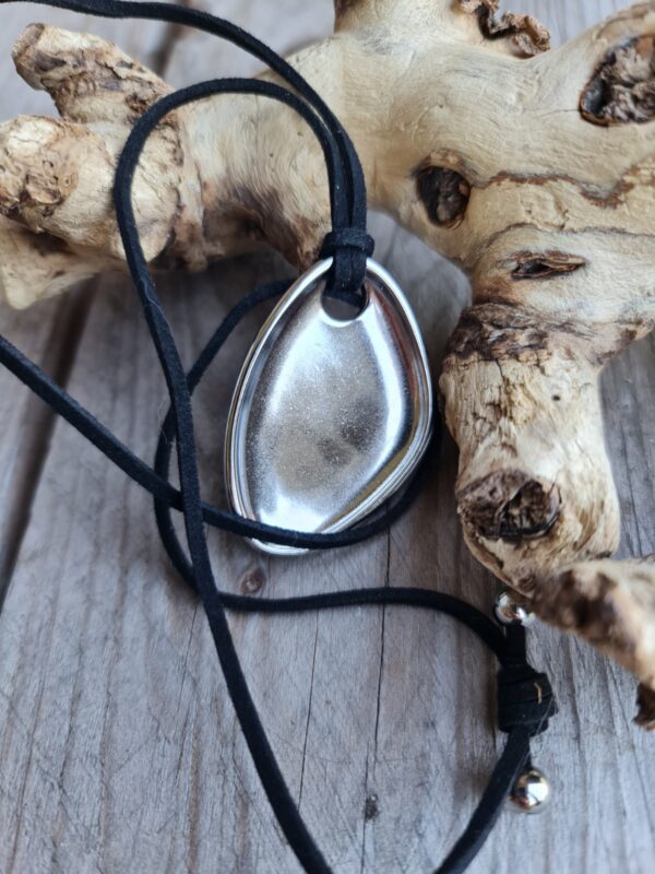 Een mooi ketting van roestvrij zilver hangen. Een druppel (fantasie) vorm hengen die haal aan achter kant is Synthetische zwarte koord