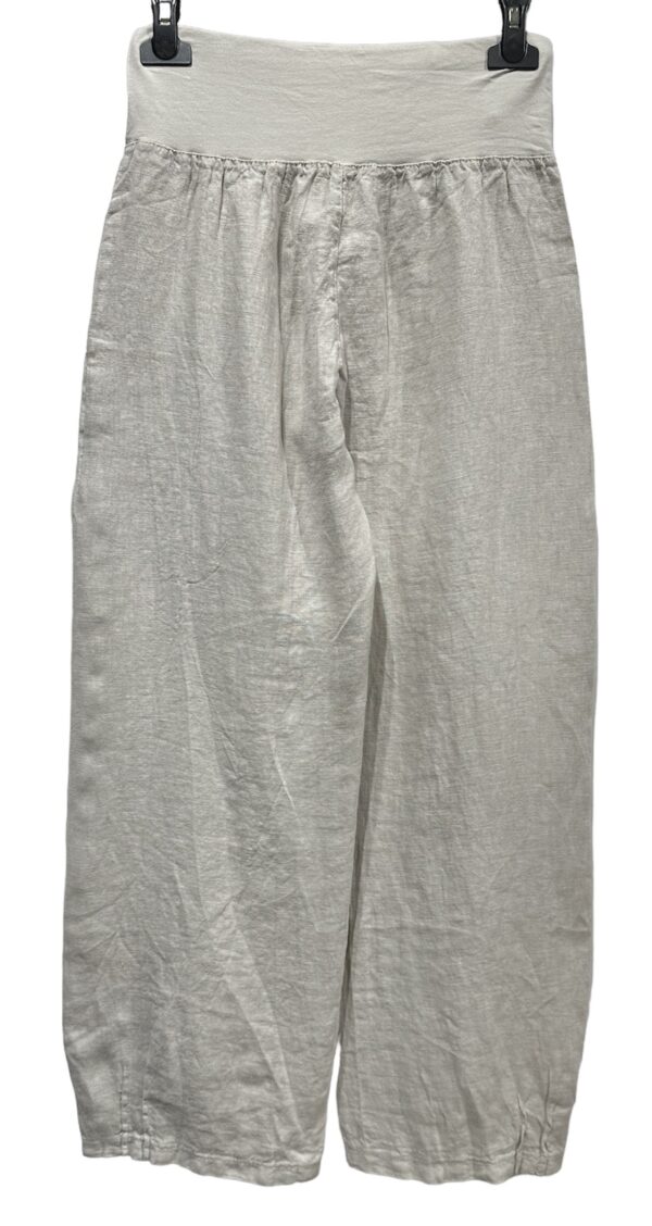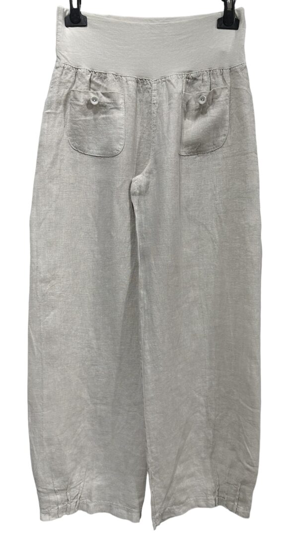 Comfortabele en luchtige linnen broek. Met handige steekzaken met knopjes en elastische talie band. De pijpen zijn versmalt met plooien onder in. Lijkt heel sierlijk.