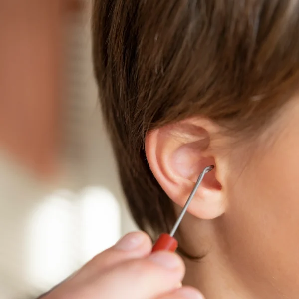 Pak het oorstokje vast bij het handvat en verwijder voorzichtig het overtollige oorsmeer dat zichtbaar is bij de ingang van het oor.