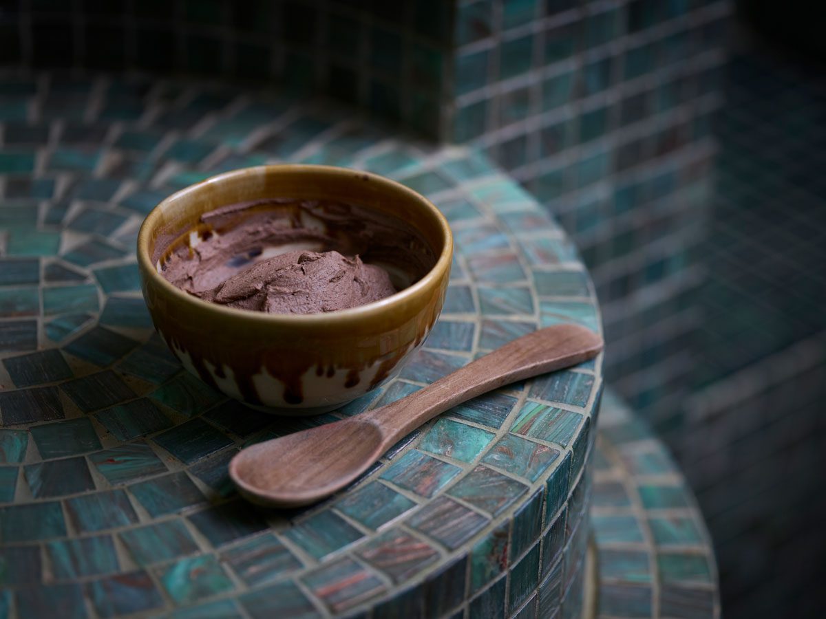 Om het bijvoorbeeld als gezichts- en haarmasker te gebruiken: meng 3 eetlepels rhassoul met 3 eetlepels warm water, roer goed en breng aan.
