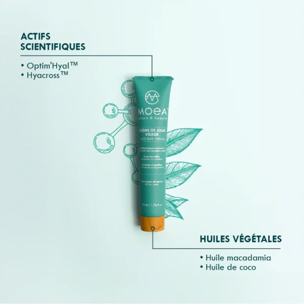 MOEA Dagcrème is ontwikkeld om te voldoen aan de specifieke behoeften van de huid gedurende de dag. Dankzij de gepatenteerde actieve ingrediënten Optym Hyal™ en Hyacross™ hydrateert en verzacht het effectief rimpels en beschermt het de huid tegen externe agressies zoals vervuiling, zon, kou en luchtonzuiverheden. Verrijkt met Macadamia en Kokos olie voor perfecte vocht en voeding balans
