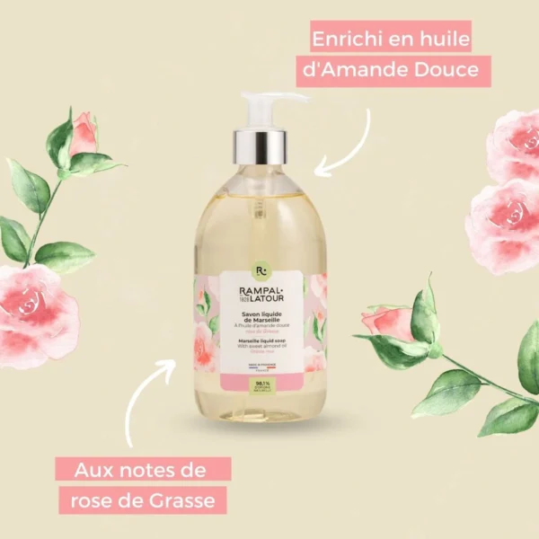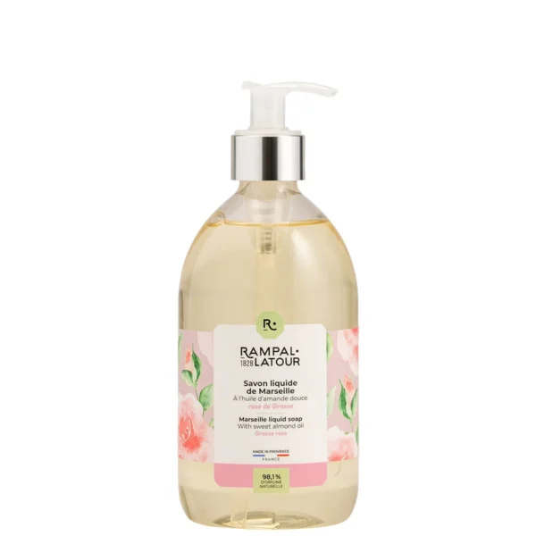 We hebben onze vloeibare Marseillezepen met noten van Grasse-roos ontworpen op basis van producten van natuurlijke oorsprong. Onze vloeibare Marseillezeep, geparfumeerd met Grasse-roos en verrijkt met zoete amandelolie, biedt een zachte en delicate bloemengeur, zowel in uw keuken als in uw badkamer.