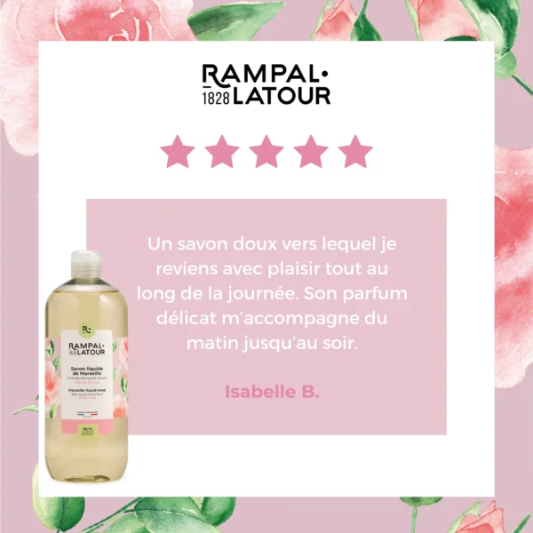 De vloeibare Marseillezeep Rampal Latour wordt volgens de traditionele methode gemaakt in een ketel op basis van 100% verzeepte plantaardige oliën.