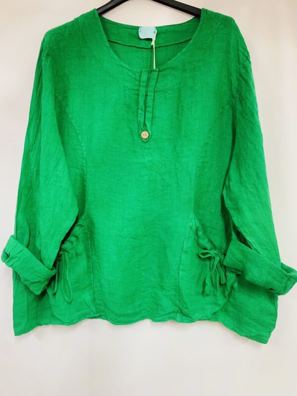 Een mooi linnen blouse met lange oprolbaar mouwen, ronde hals met een kleine decoratie, aan voorkant zijn leuke en handige zakken met een strikje