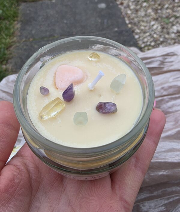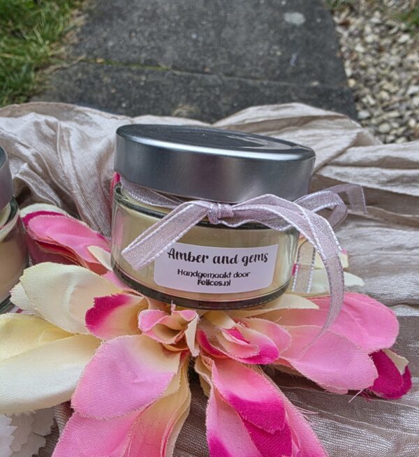 De kaars is licht beige kleur in een geur van moderne Amber en toegevoegde edelsteen steentjes (onder andere amethist, rozenkwarts, jade, citrien).