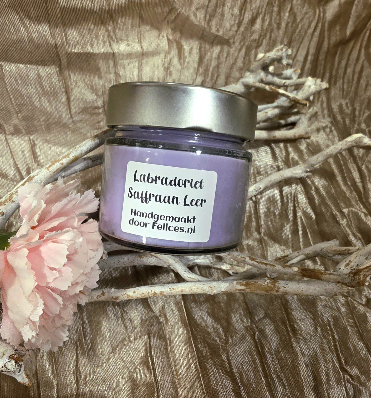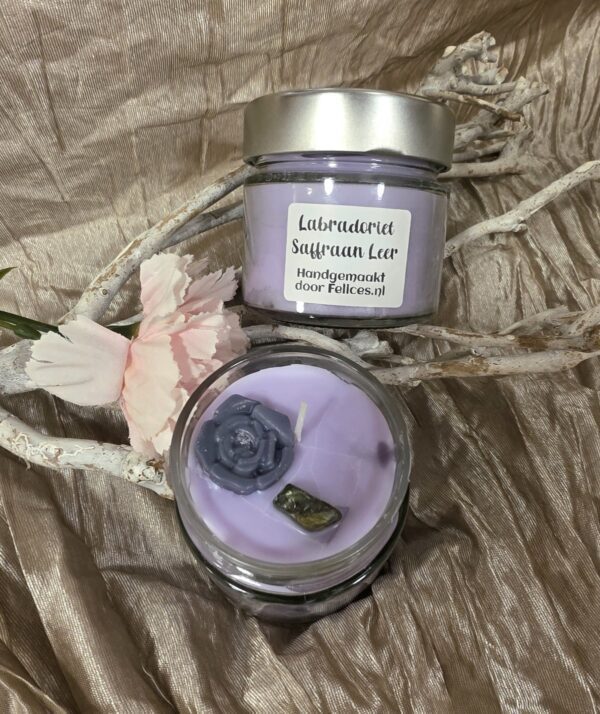 De kaars is licht paars kleur in een geur van moderne Saffraan Leer en toegevoegde edelsteen steen van Labradoriet. De steentjes zijn overal in de pot maar ook hen ik gel wax toegevoegd voor een leuke effect. Een bijzondere kaars voor unique momenten.