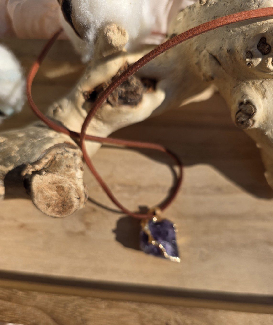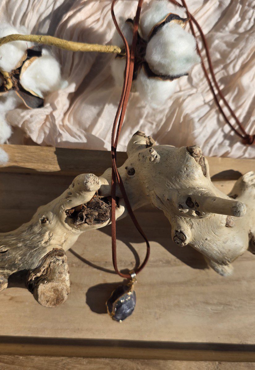 Handgemaakte mooi lange ketting, past bij vele delegerend. De koord is van suede en de steen/kristaal is ruw met gouden decoratie. De ketting heeft simpele knop achter die verstelbaar is, makkelijk aan te passen op wens