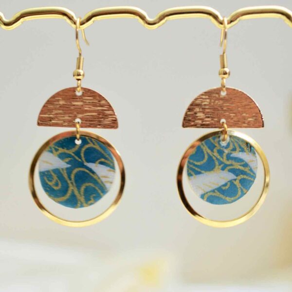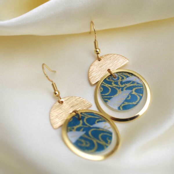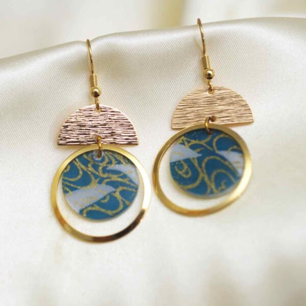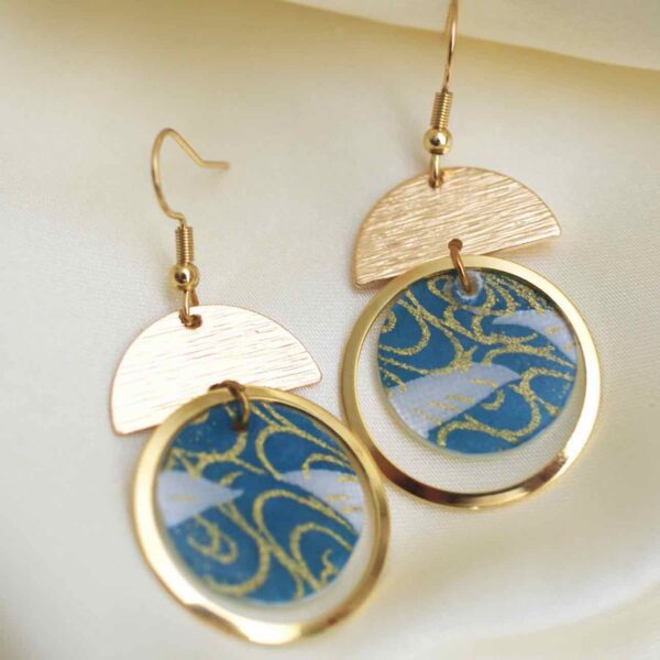Minimalistisch en tijdloos, de oorbellen bestaan uit een kleine ronde parelmoeren sequin met blauw-wit-gouden washi-papier, en mooie gehamerde kwastjes met een grote ring en anti-allergische messing oorhaken.