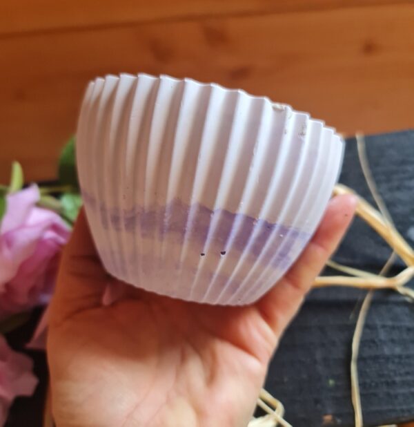 Handgemaakte kaars van ecologische soja wax. De poten hebben we zelf gemaakt van gips. De kaars is is in een natuurlijke kleur pot met gouden strepen. De wax is in licht beige kleur met prachtige edelsteen chips van Amethist en groene Flouride. Ook is een leuke kleine roosje er op