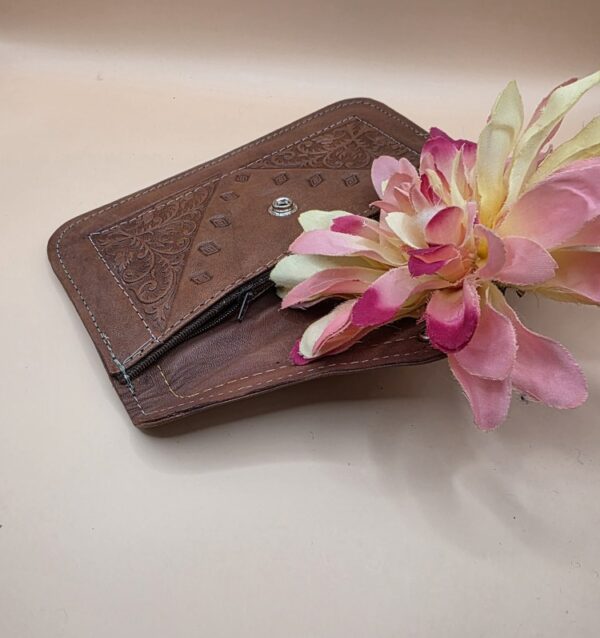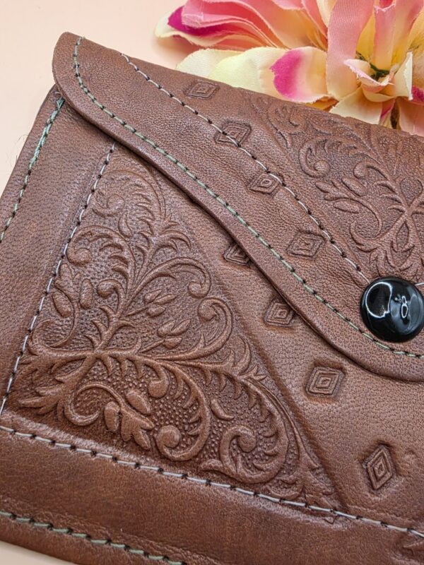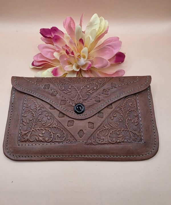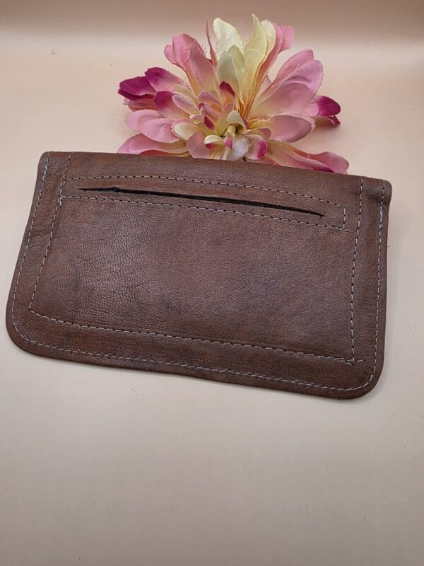 Gekleurde platte portemonnee gemaakt van leer van zeer goede kwaliteit. Het is een portemonnee met één knop en twee binnenvakken: een vak met ritssluiting en een vak zonder ritssluiting. Op de achterkant hebben sommige een achterzak.