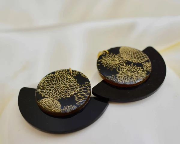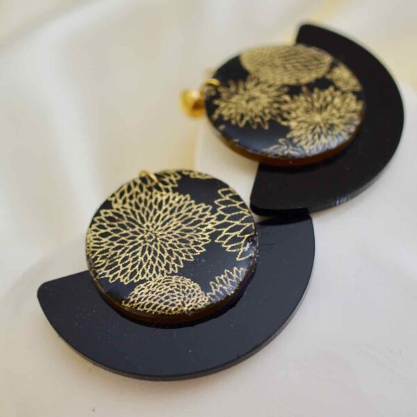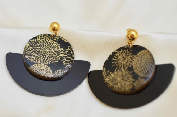 Zwart plexiglas en Japanse papieren waaier oorbellen Deze unieke oorbellen combineren moderniteit met Japanse verfijning. Ze bestaan uit een zwarte plexiglas waaier hanger en een ronde medaillon bedekt met zwart en goud Japans papier, en zijn verfraaid met een mannelijke harsafwerking.