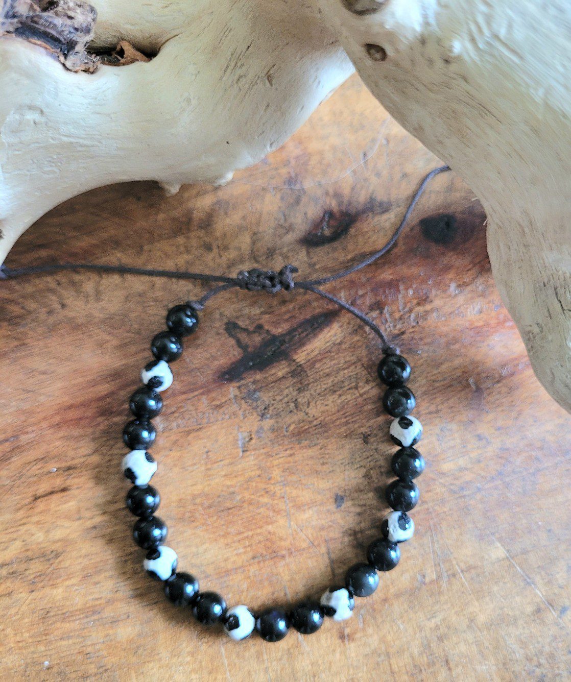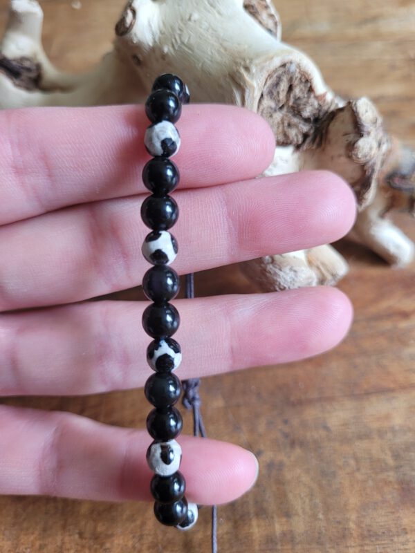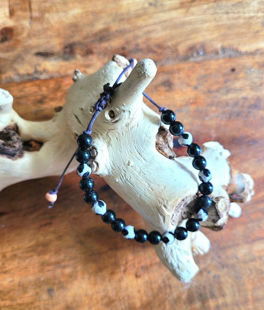 De kralen zijn 6mm groot, de zwarte zijn Onyx en de geleurde zijn Agaat. Mooi armband voor heren