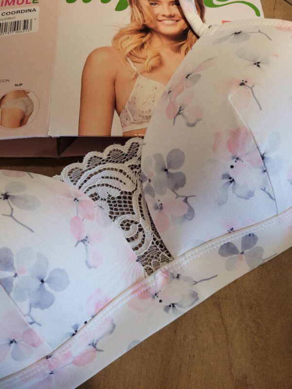 De set is van witte kwalitatieve materiaal in bloemen. De beha is geschikt voor kleinere borsten, met een mooi kant tussen de borsten. De beha is vooergeovrmd met beugels. Se slip is met doorzichtige kant op de achter kant.