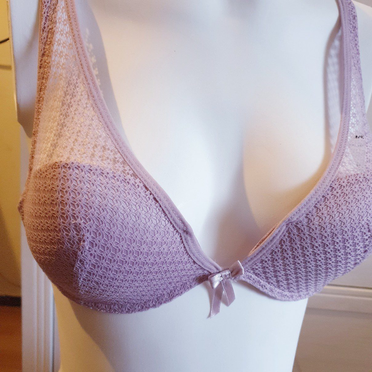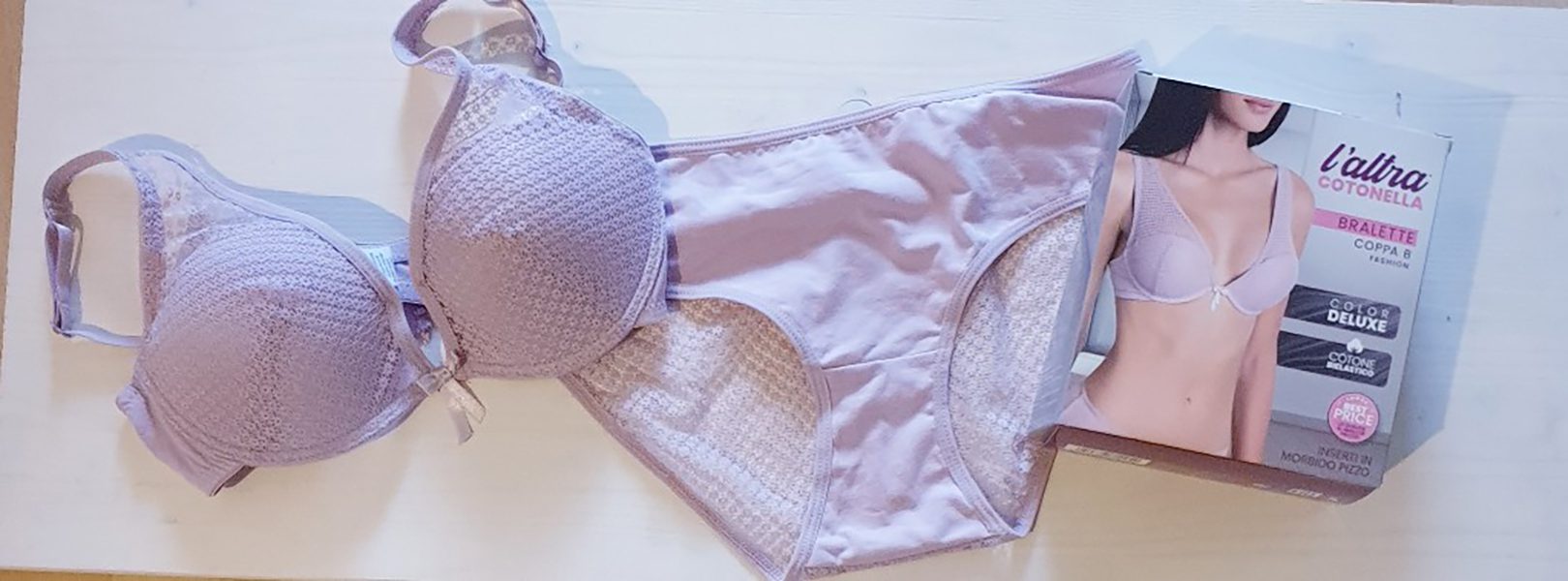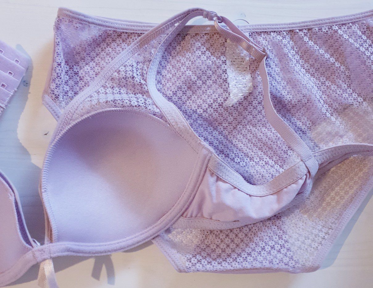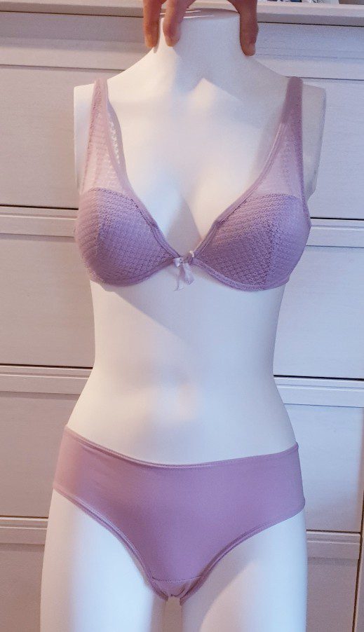 Erg mooi model katoenen lingerie set. Bestaat uit beha met voorgevormde cup en met driehoekig kant. De slip is katoen in de voorkant en doorzichtige kant achter.