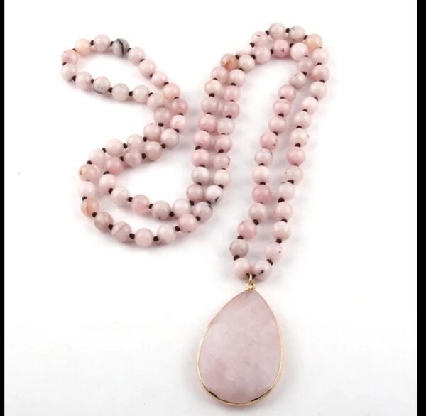 Prachtige lange edelsteen ketting met meta kralen van 8mm (Rozenkwarts) en een mooi rozenkwarts hanger van 5,5cm omhuld in een gouden frame