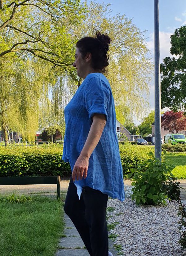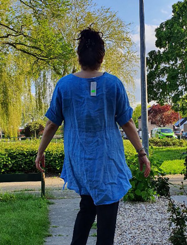 Mooi linnen top in BLAUW kleur met korte mouwen, asymmetrisch ronde hals maat 42