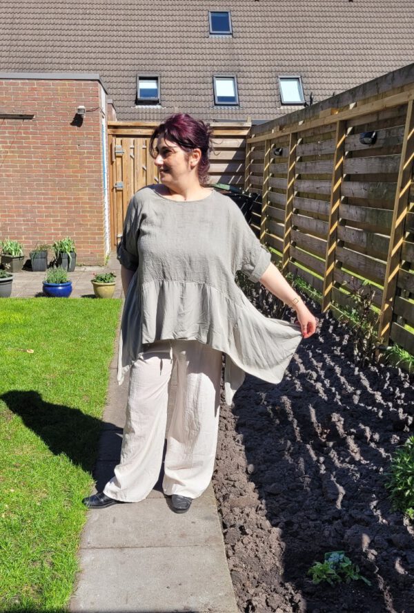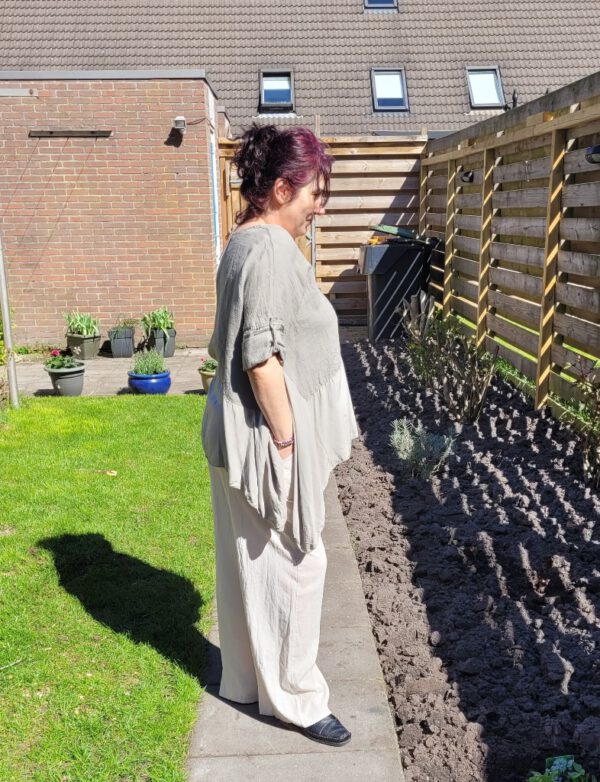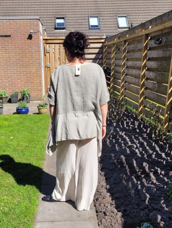 Mooi linnen top met boven puur katoen en de volant is van dunne doorzichtige viscose. De mouwen zijn verstelbare, met ronde hals. De volant is aan zijkanten langer met een split