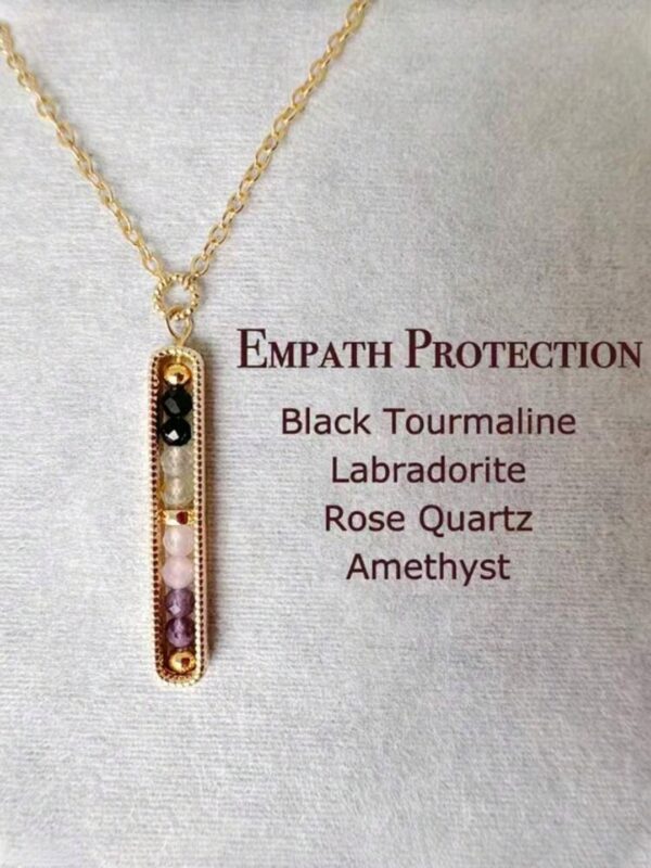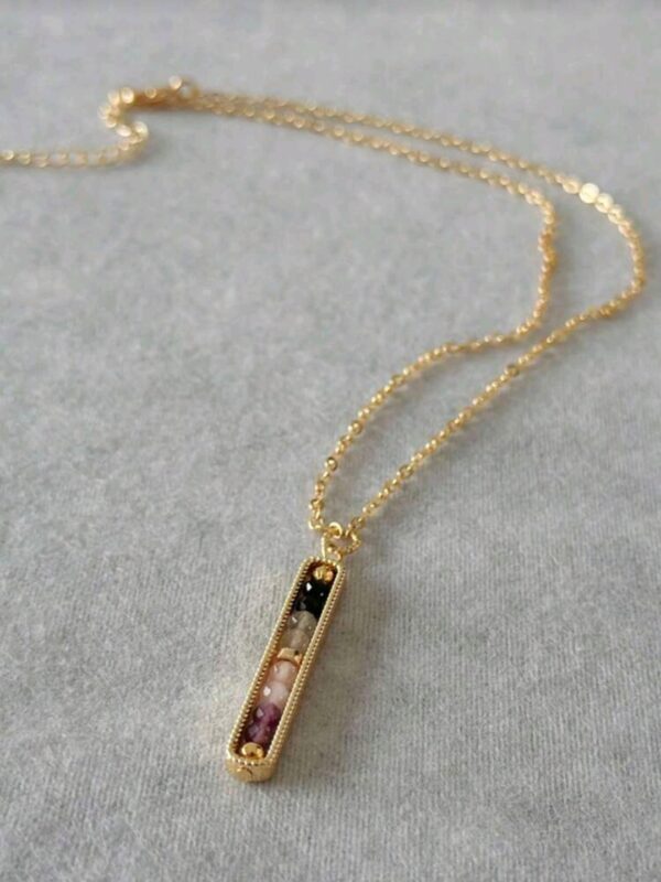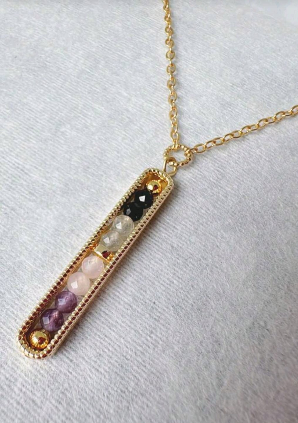 Prachtige en simpele en toch elegante ketting van roestvrij staal ketting en de hanger is in een stalen langwerpige frame, Zwarte Toermalij, Labradoriet, Rozenkwarts en Amethist stenen zijn een eye catcher van deze ketting. De combinatie van deze stenen en kwarts helpen in Bescherming en Empathie