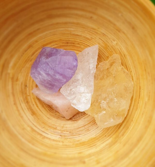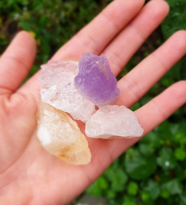 Een zakje van 4 meest bekkende kristalen in een, The bag of Life Amethist, Citrien, Rozenkwarts en Berg kristaal