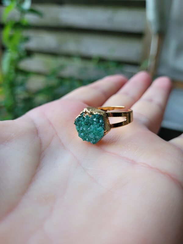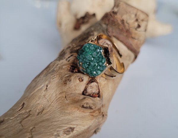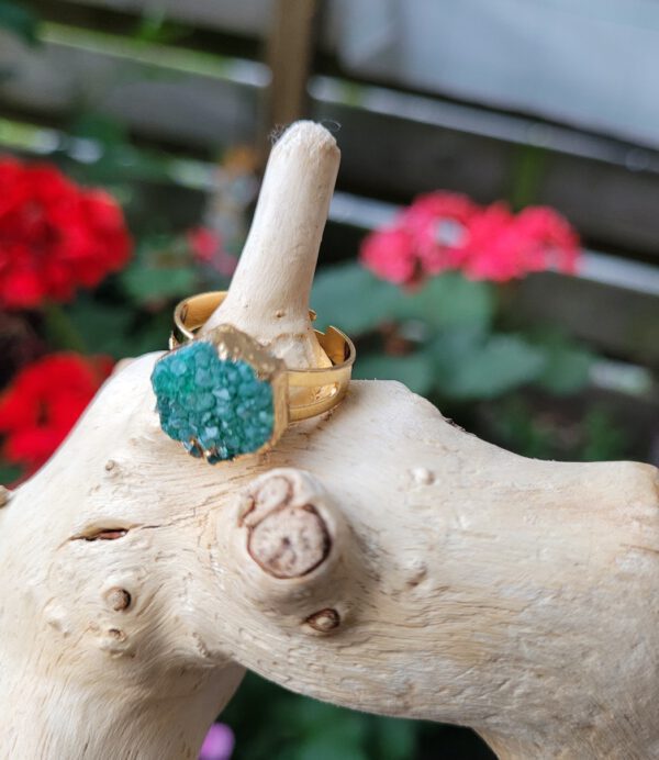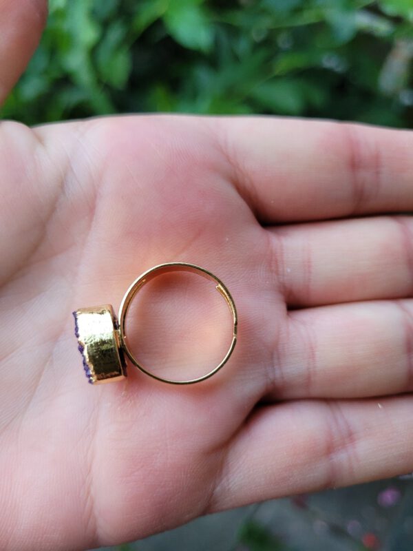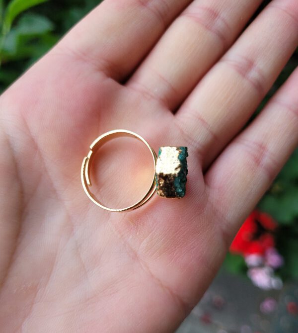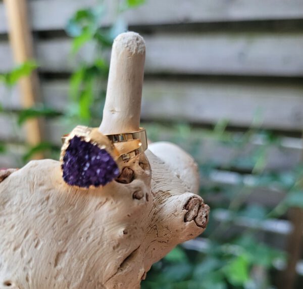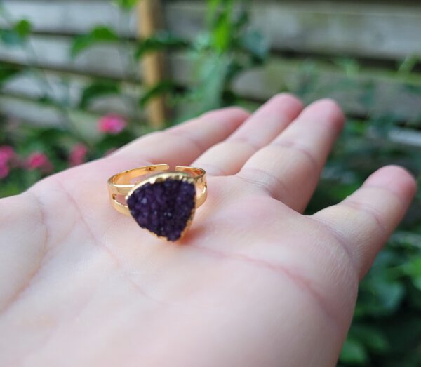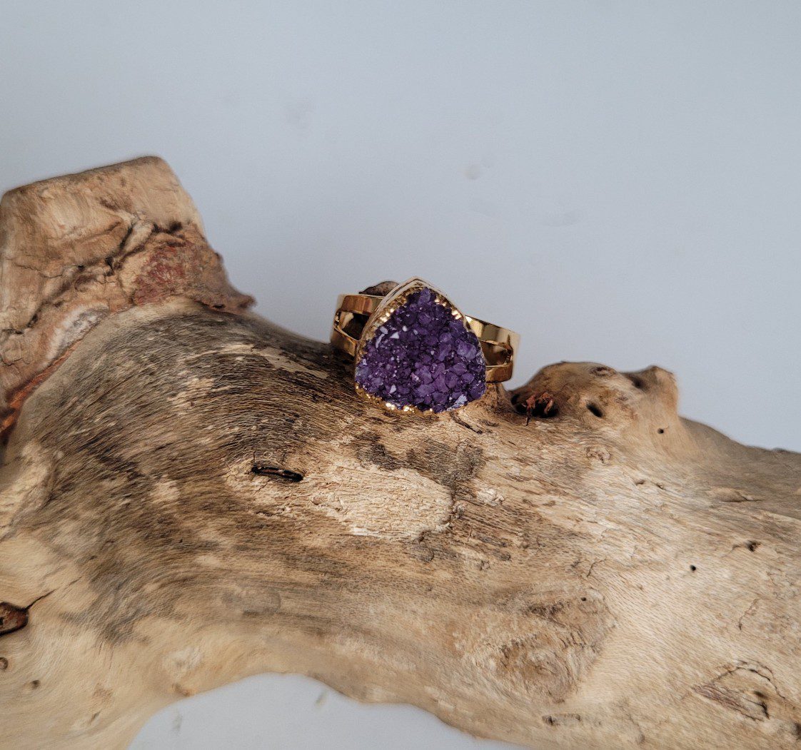 De frame is goudkleurig en de ringen zijn verstelbaar. Een kwarts die geoxideerd is in groen en paars kleur. Leuke boho ringen die op elke vinger passen