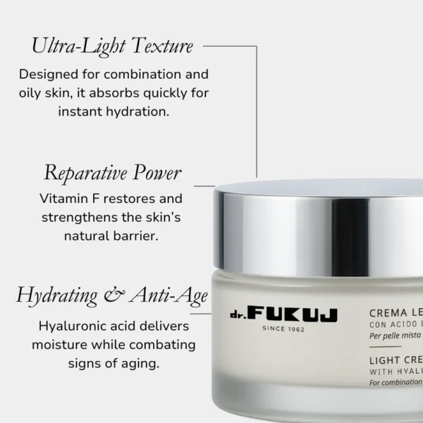 - Crème met een ultralichte textuur, speciaal ontwikkeld voor de gecombineerde of vette huid. De lichte textuur zorgt voor snelle absorptie en directe hydratatie. Het combineert de herstellende werking van vitamine F met de hydraterende en anti-aging werking van hyaluronzuur.Kwaliteit gegarandeerd