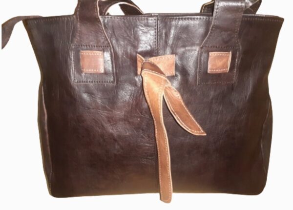 Rechthoekige damestas van zeer goede kwaliteit. Het is een tas met twee handgrepen die van binnen gevoerd is met twee binnenvakken. Met een strik van lichtere kleur leer die de hele tas omarmt, effectief en zeer leuk
